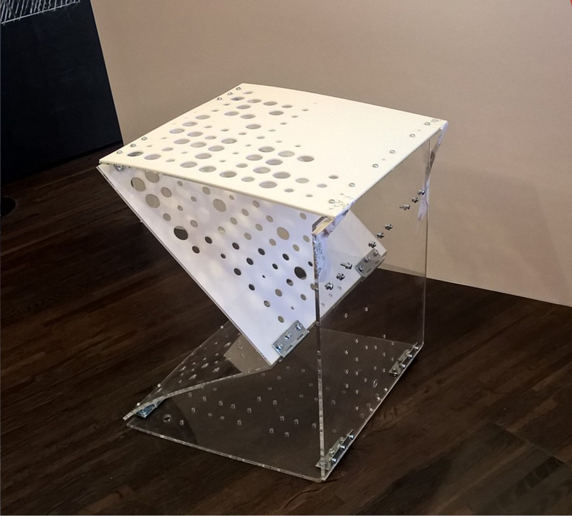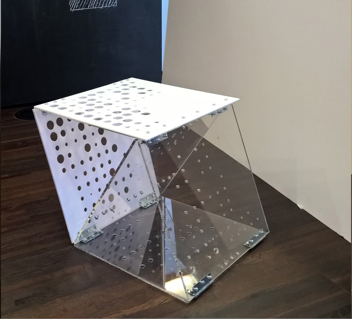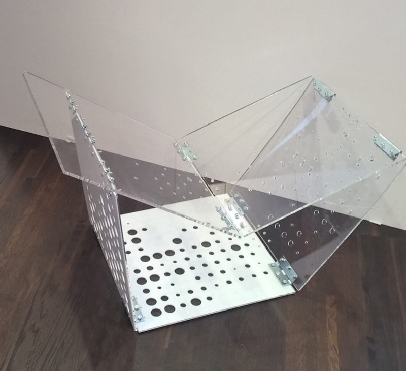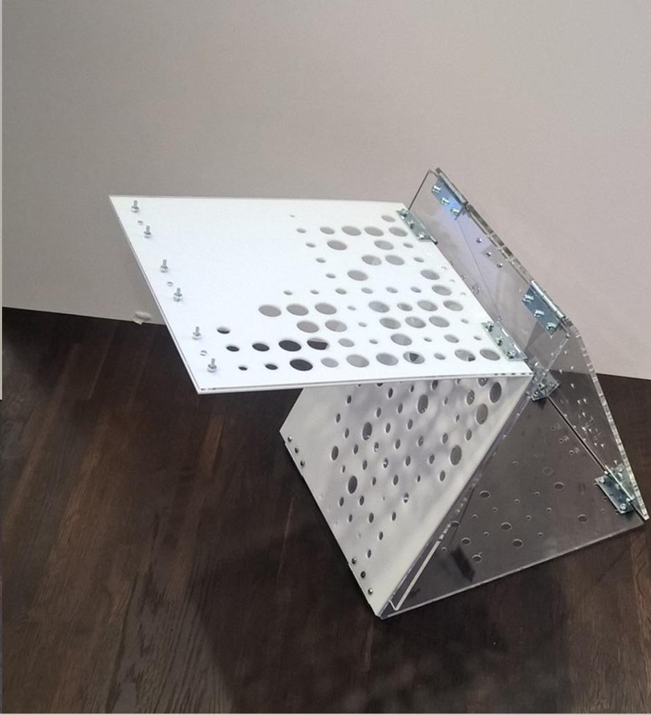 FOLDING PLEXI is inspired by architect Dror Benshetrit’s Pick Chair. Pick Chair is a cantilevered chair that retracts to a flat 2D surface once lifted, hangs on the wall as an artwork, and transforms into a 3D seat once propelled on the ground. Driven by the need for a chair to offer visitors to my cubicle at the Bahen Center for Information Technology, and limited by the tight space available, I decided to design a folding chair that takes up no floor space and also serves an auxiliary function as a clear whiteboard or a folding desktop screen. FOLDING PLEXI was designed with the same principle as Pick Chair, but using ¼” transparent and perforated opaque acrylic to maintain a modern and airy vibe. Because acrylic at such thickness is rather fragile, I relinquished the cantilever concept and added a fifth panel that folds in to support the seating panel above.
