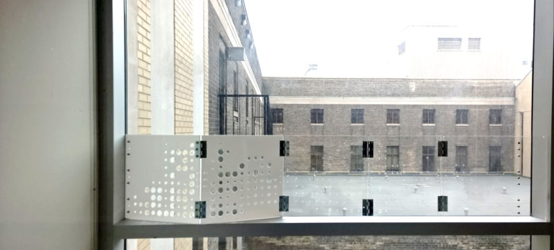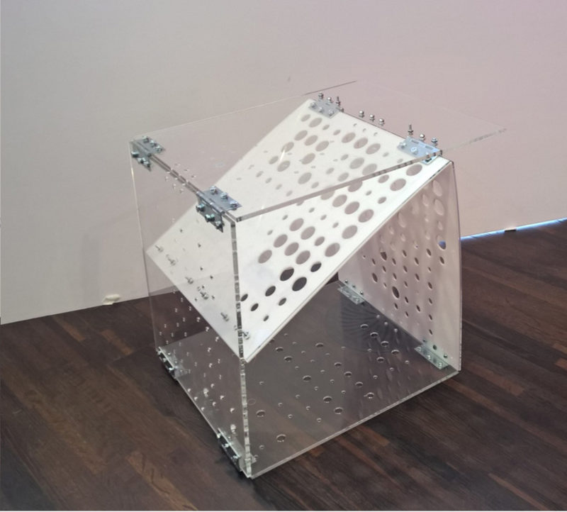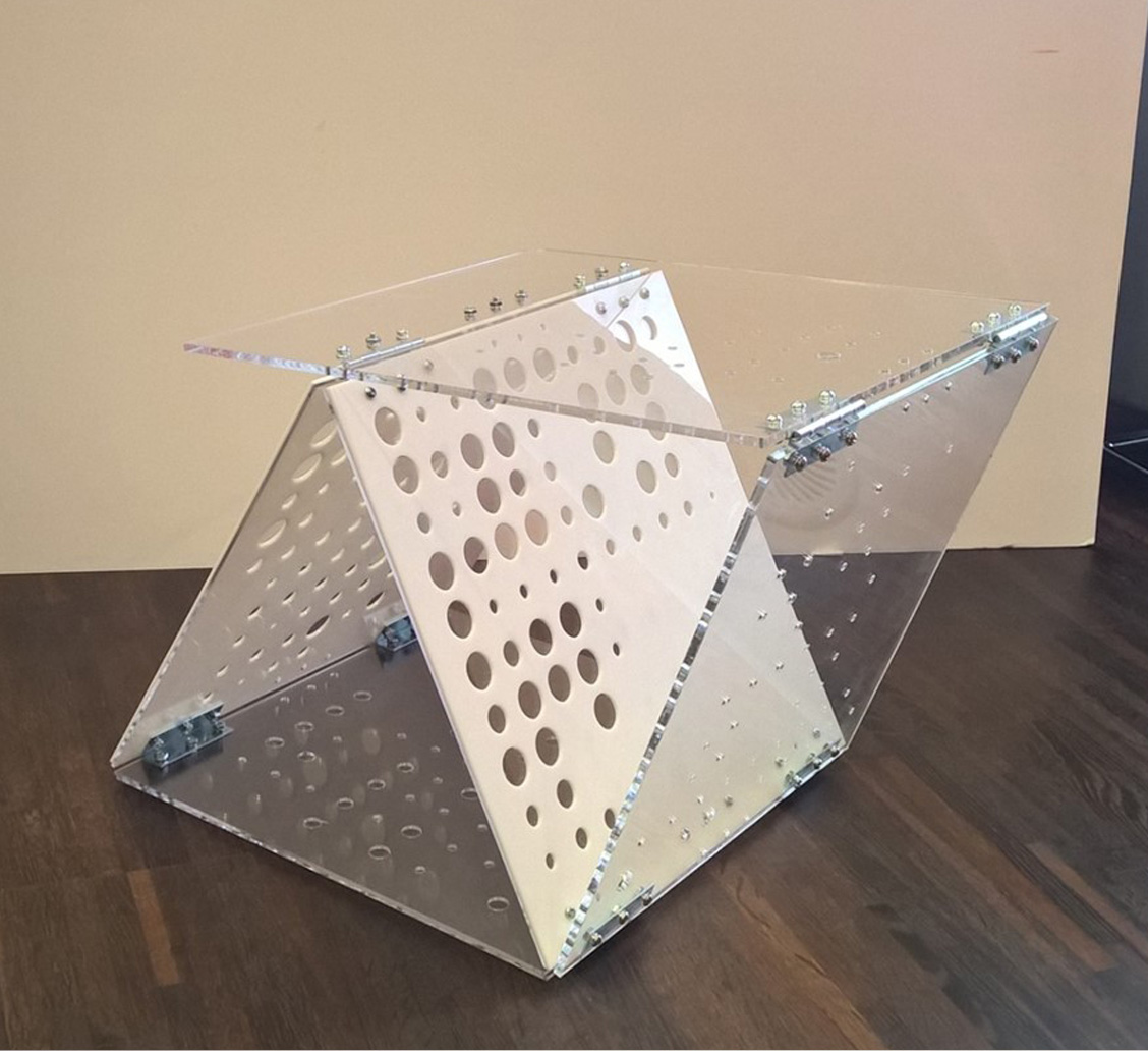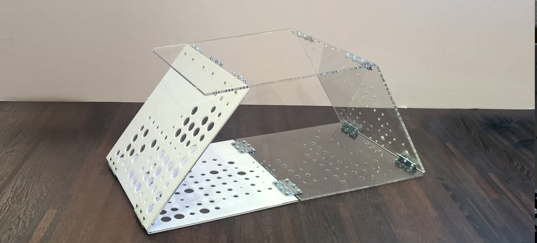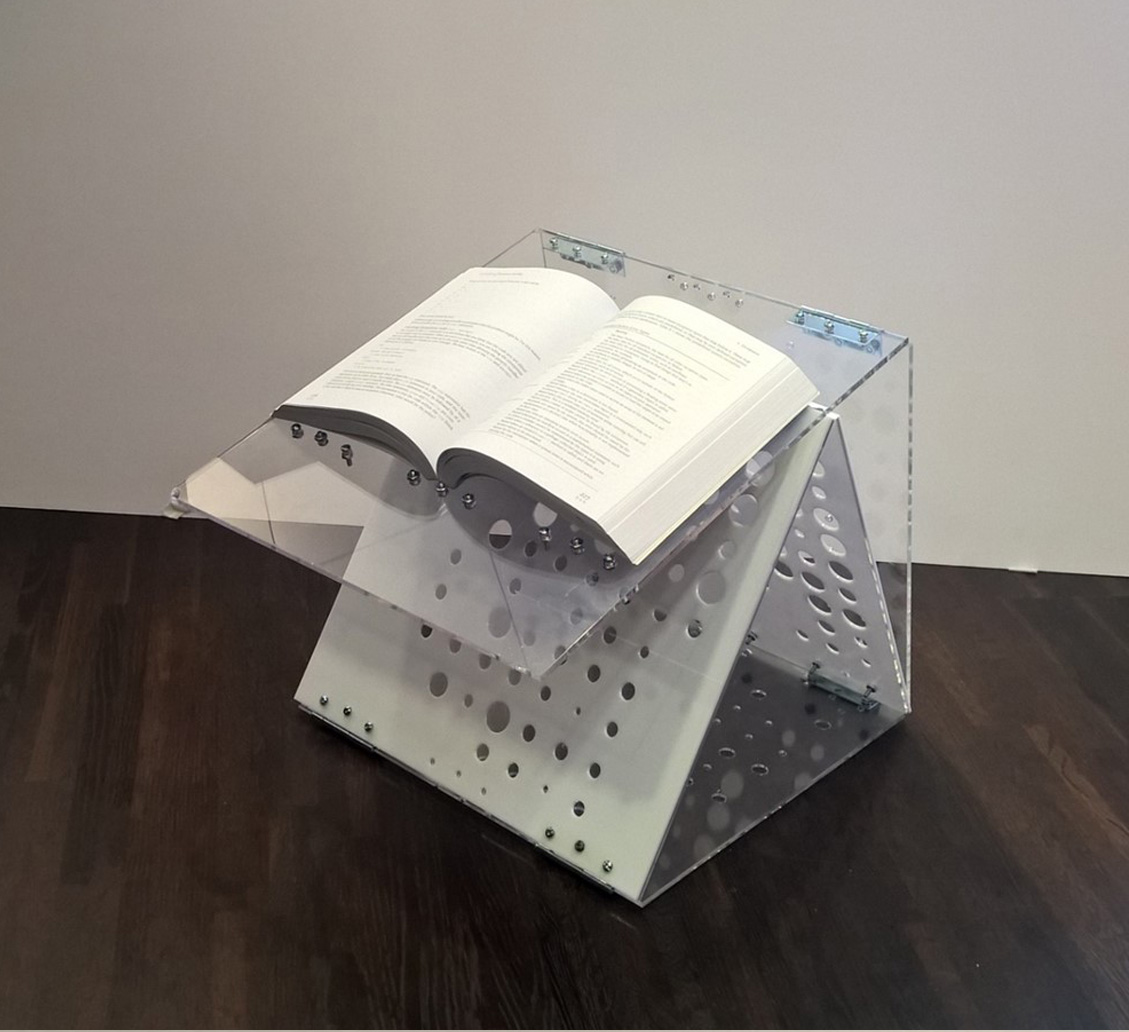 FOLDING PLEXI is inspired by architect Dror Benshetrit’s Pick Chair. Pick Chair is a cantilevered chair that retracts to a flat 2D surface once lifted, hangs on the wall as an artwork, and transforms into a 3D seat once propelled on the ground. Driven by the need for a chair to offer visitors to my cubicle at the Bahen Center for Information Technology, and limited by the tight space available, I decided to design a folding chair that takes up no floor space and also serves an auxiliary function as a clear whiteboard or a folding desktop screen. FOLDING PLEXI was designed with the same principle as Pick Chair, but using ¼” transparent and perforated opaque acrylic to maintain a modern and airy vibe. Because acrylic at such thickness is rather fragile, I relinquished the cantilever concept and added a fifth panel that folds in to support the seating panel above.