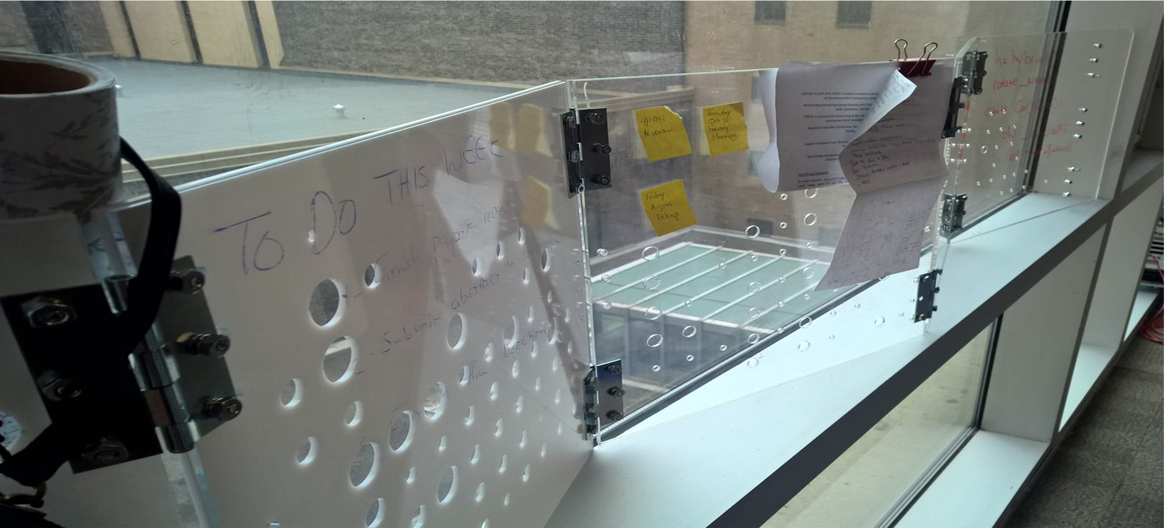 Each panel is attached to the adjacent ones using two 3-1/2″ stainless steel butt hinges on each side (conventional door hinges), washers, and 3/16” screws. Originally, I chose ¼” plexi because it is the thickest transparent material I found on campus that seemed durable enough. Once I started to assemble the pieces however, it proved to be both heavy and too week to support more than 70lb. Moreover, the hinges were too loose and never kept the panels at 90 degrees. I did notice though that the plexi panels can fold, take on several shapes, and maintain their assembly due to the projecting screws added for hanging purposes (see figure 7). With some patience and trial and error, I was able to generate 9 free-standing forms such as coffee tables and shelving units (see the attached slides). Due to the lack of space (and visitors) in my cubicle, I currently have the FOLDING PLEXI on the adjacent window ledge and use it to inscribe notes with markers, prop papers and other items, and post reminders.
