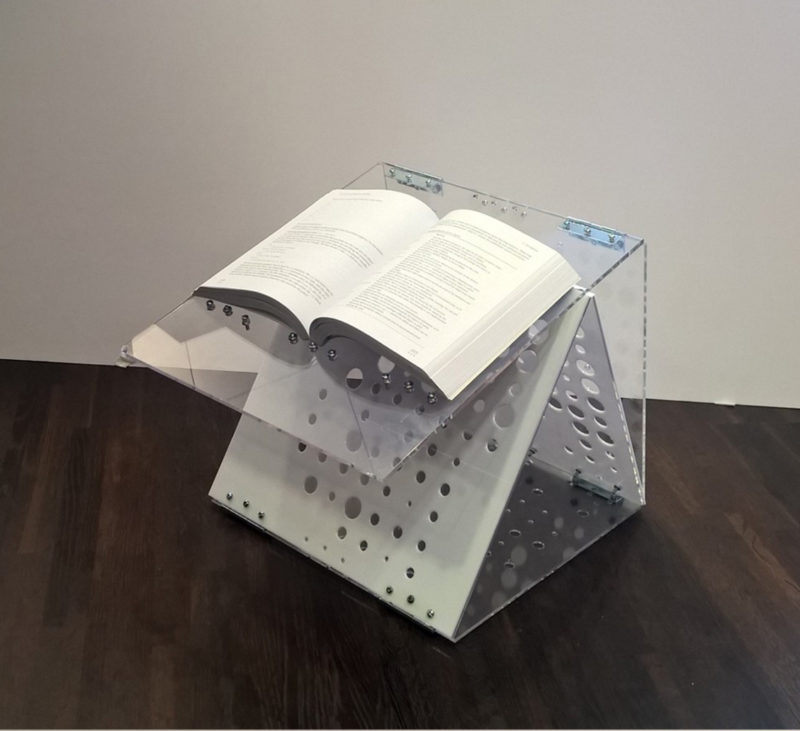 210-IN-1 FOLDING PLEXI is a group of transparent and opaque acrylic panels hinged together. Each piece pivots in the range of -45 to 45 degrees relative to its neighbors. Cumulatively, the rotating panels generate a variety of assemblies that can be used as a coffee table, laptop stand, shelving unit, or even a mini folding screen for hanging items or writing notes with dry erase markers. FOLDING PLEXI can also be hung on solid or glass walls as a clear whiteboard or a piece of art. Because of its perforations and transparency, it does not obscure views or the penetration of daylight.