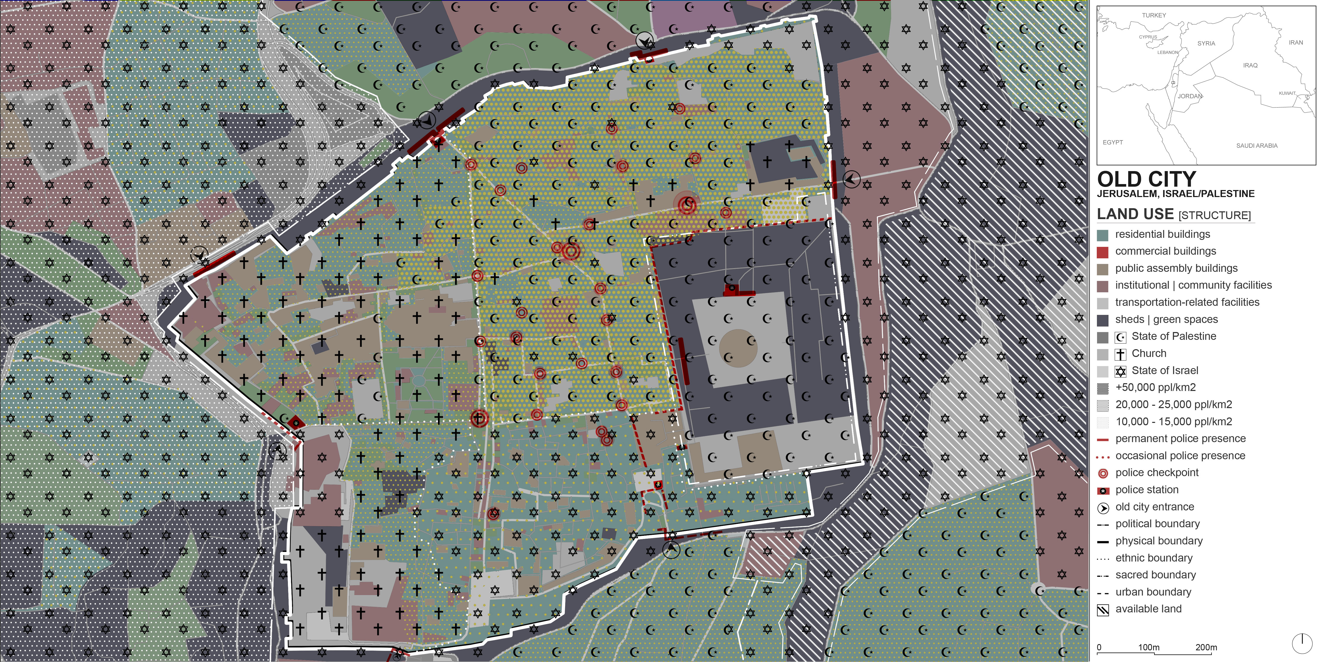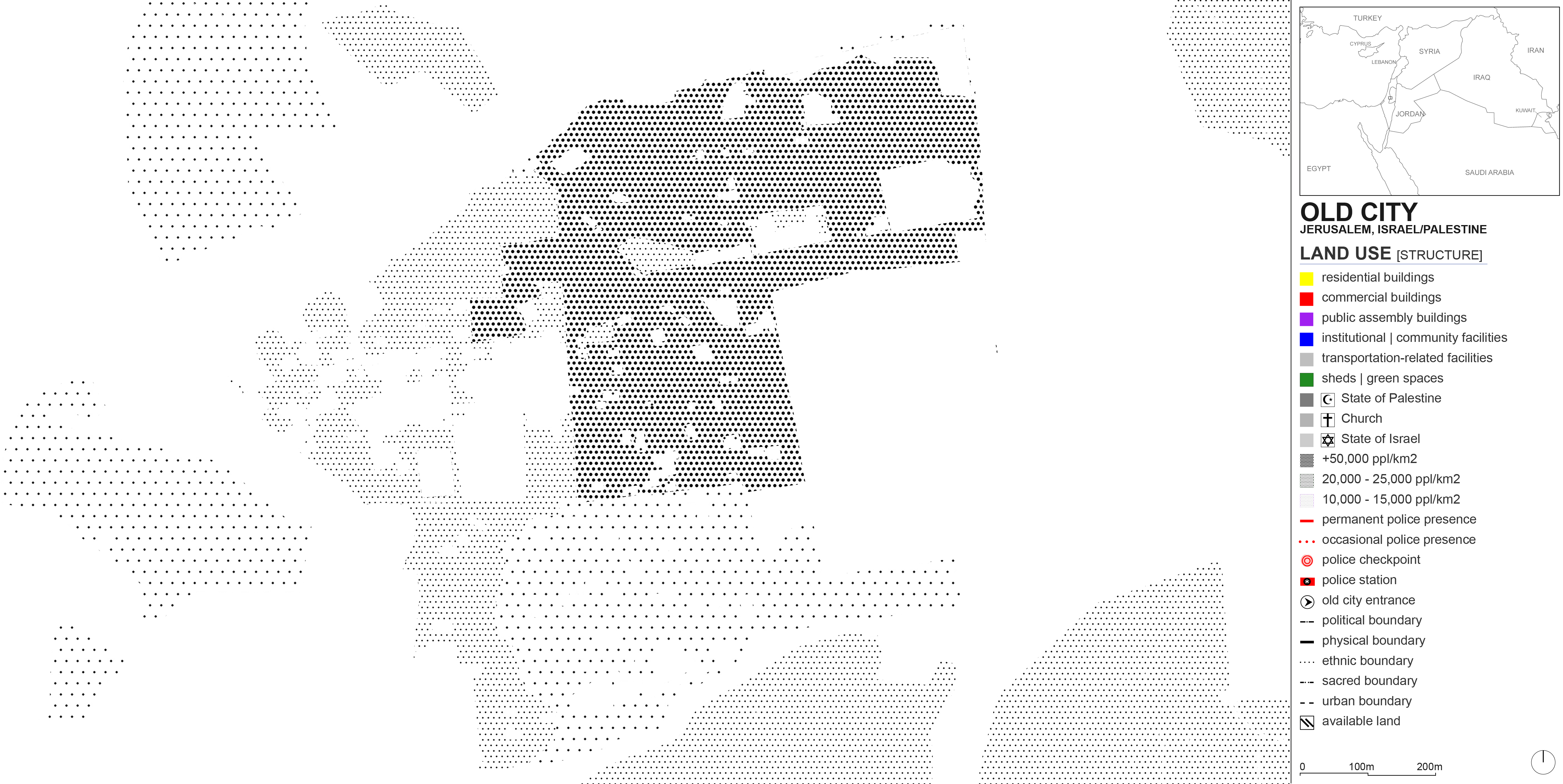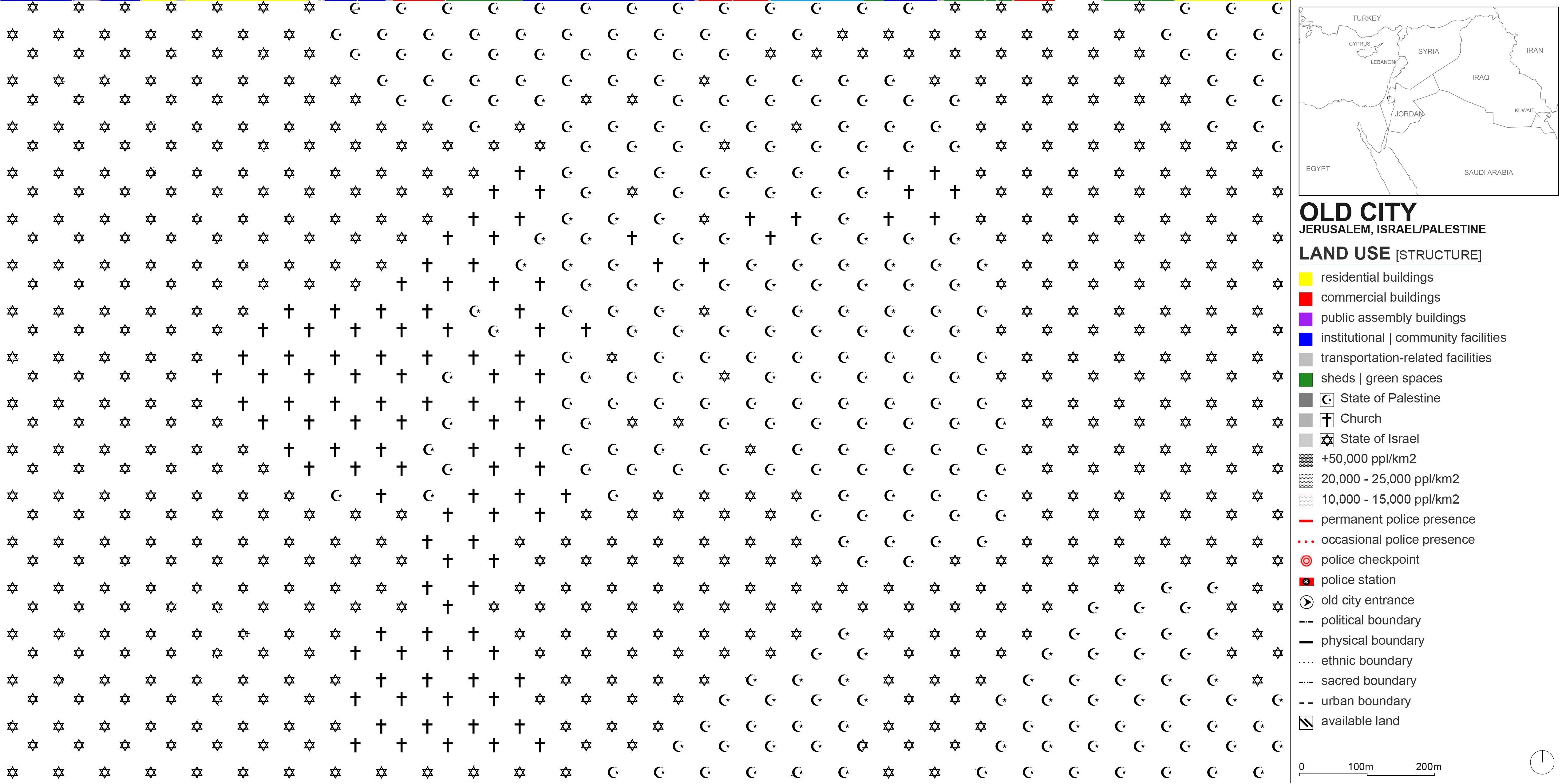 Land use maps are typically made up of color blocks where each color designates a specific use. In the Old City of Jerusalem, it is not possible to simply color entire blocks, because each small parcel of land could simultaneously be a shop, a residence, and a religious establishment – all very tight and compact. The confluence of three religions there and the tense political climate further adds to the complexity of capturing land use. Functions, ethnicities, secular structures, sacred spots, physical boundaries, and political nodes all seep into each other. This is why I resorted to mapping the Old City’s land use (and other data) on a pixel by pixel basis, triangulating sources such as Google Street View, YouTube videos, and documentaries to designate each pixel. For the studio review, I printed the layers on Mylar paper to keep the stacking effect. Here, the layers are simply shown by reducing their transparencies in the first accompanying image. The rest shows the individual layers.