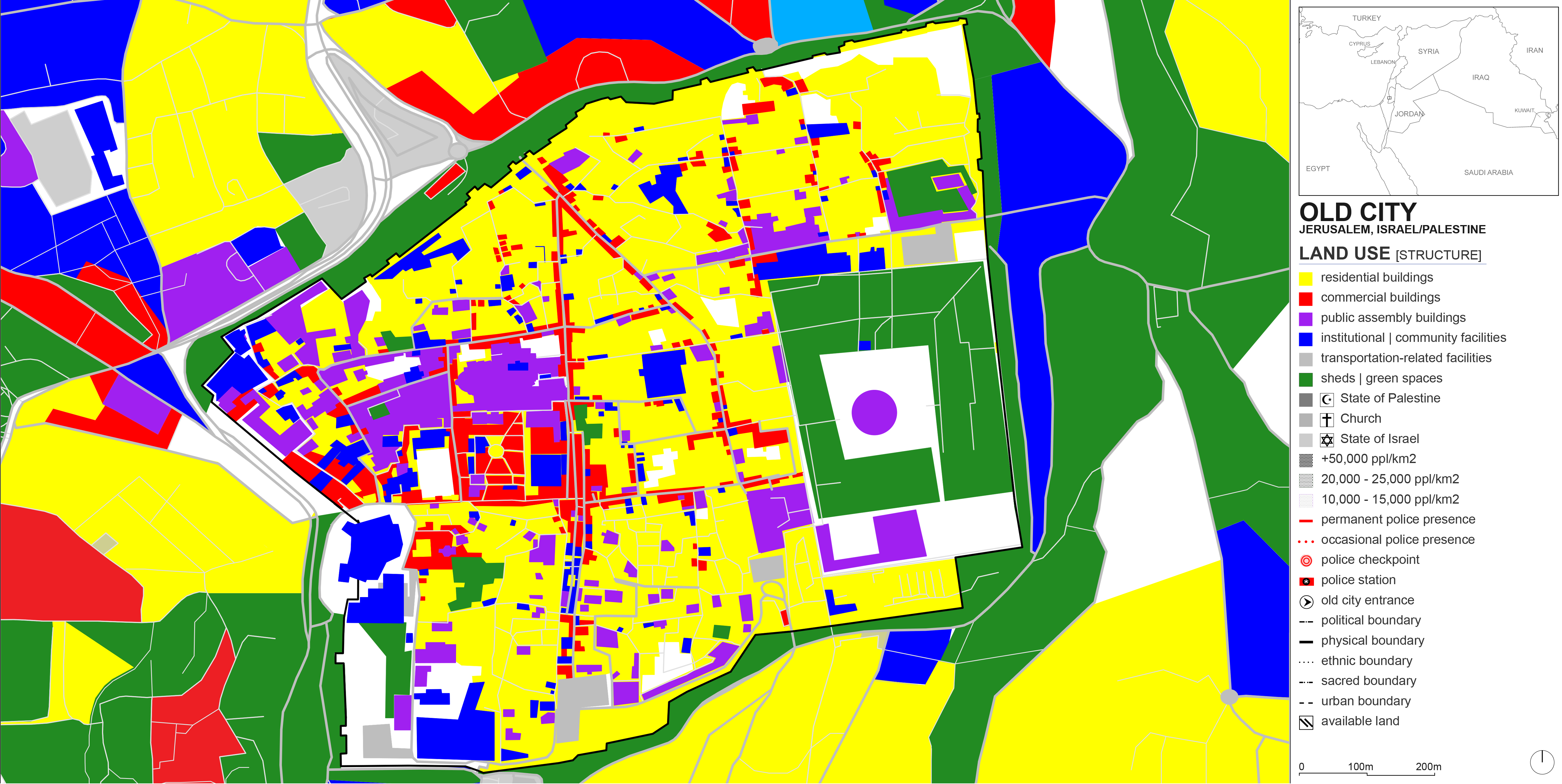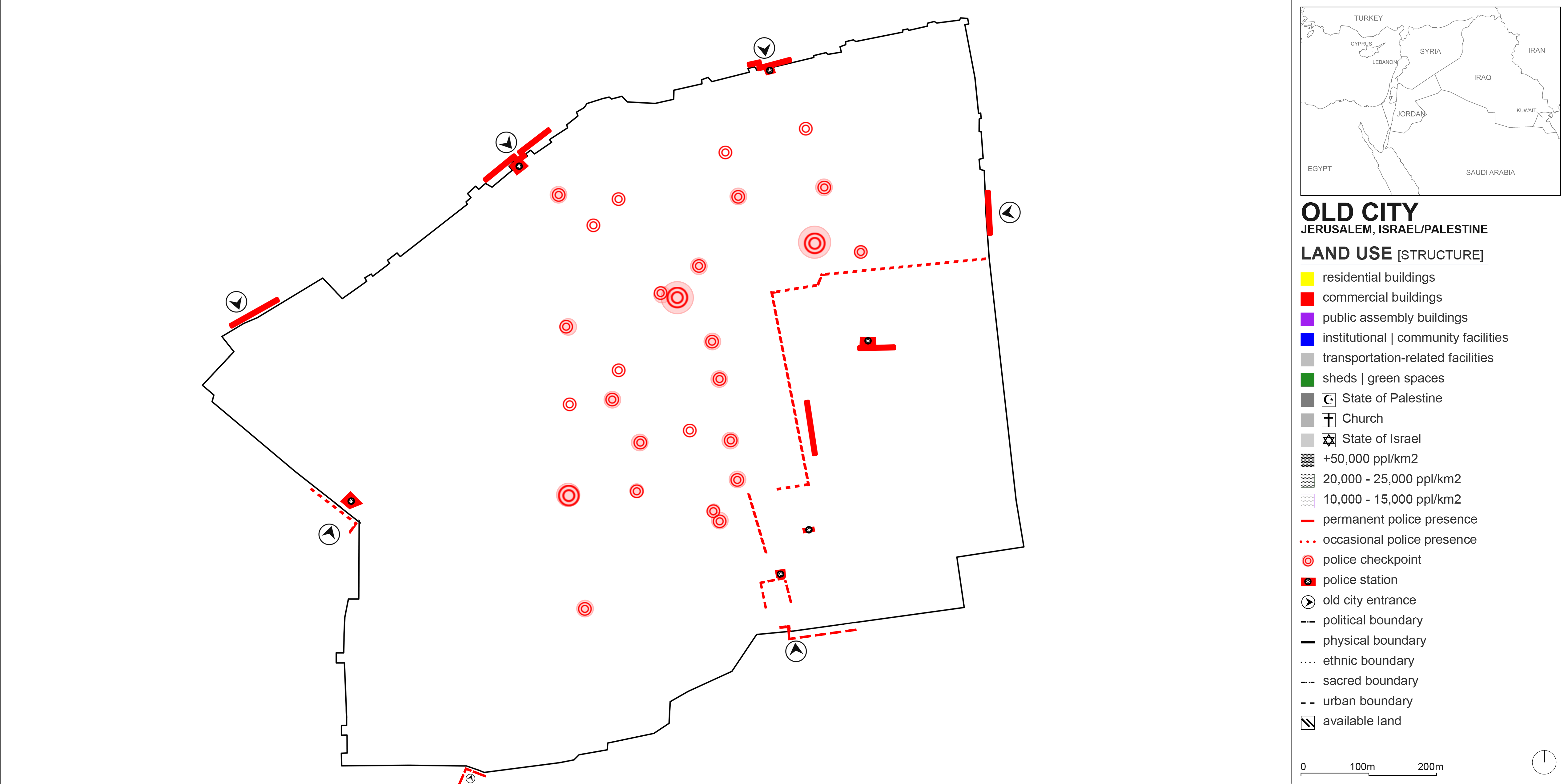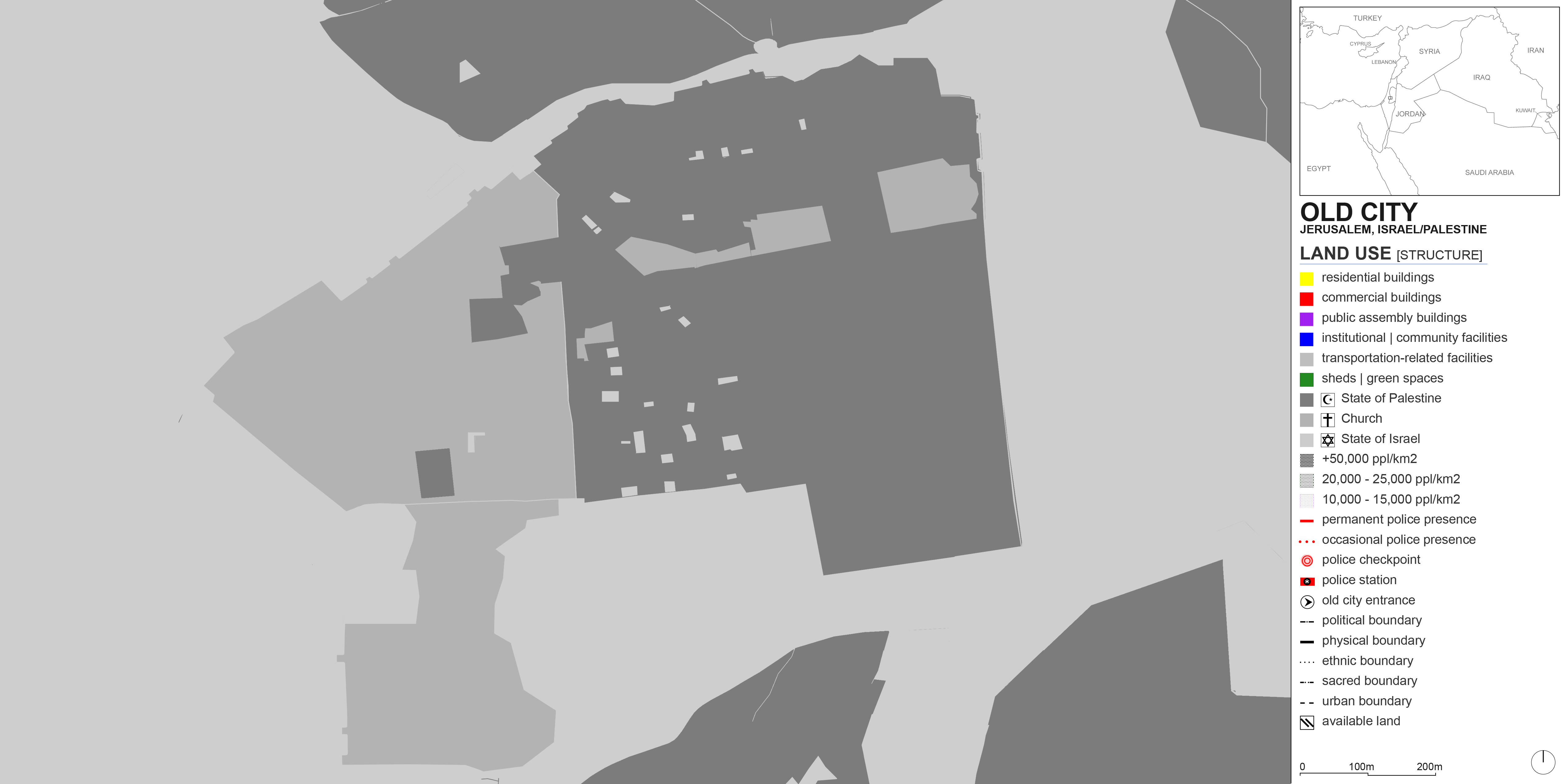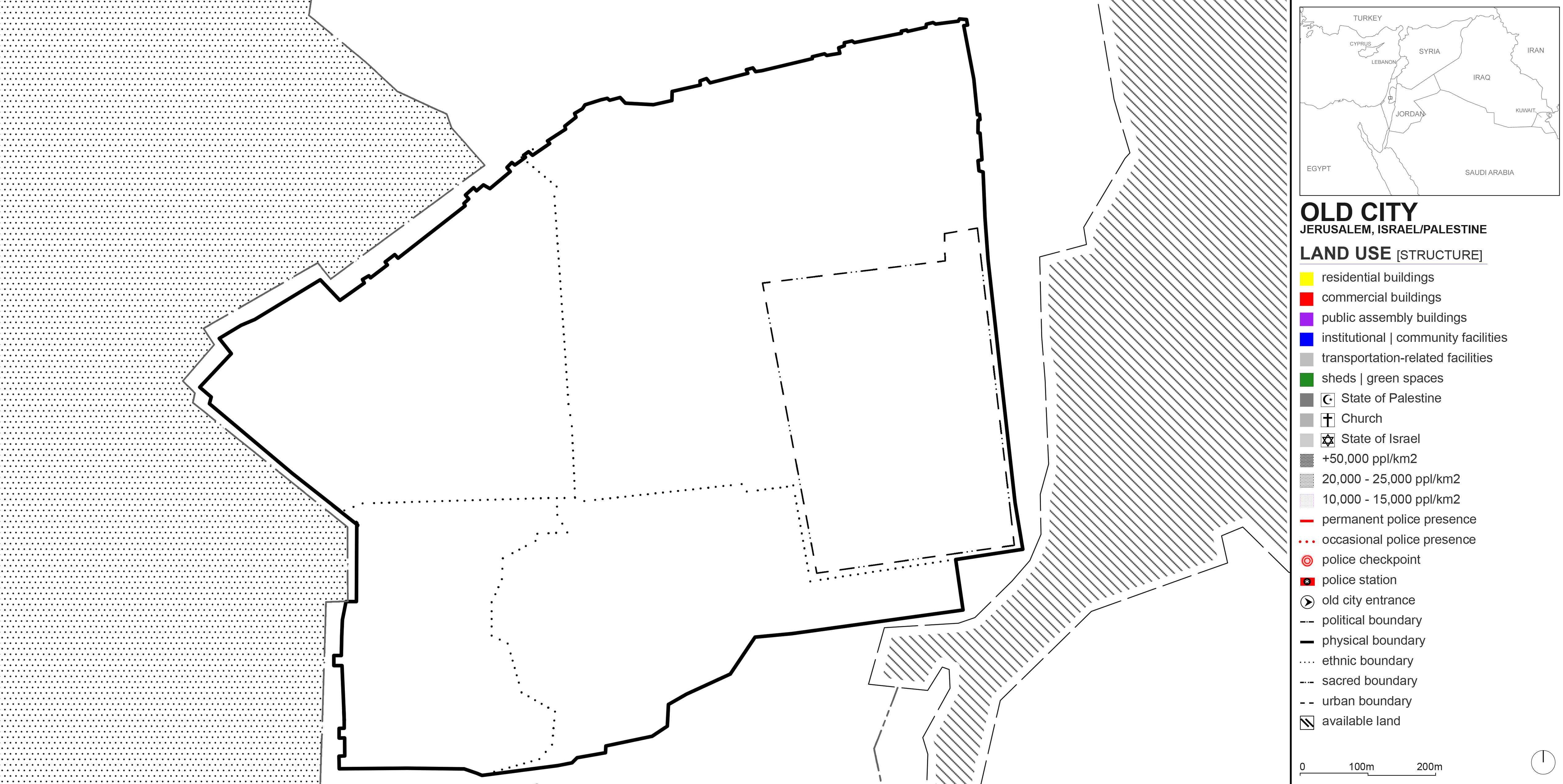 Land use maps are typically made up of color blocks where each color designates a specific use. In the Old City of Jerusalem, it is not possible to simply color entire blocks, because each small parcel of land could simultaneously be a shop, a residence, and a religious establishment – all very tight and compact. The confluence of three religions there and the tense political climate further adds to the complexity of capturing land use. Functions, ethnicities, secular structures, sacred spots, physical boundaries, and political nodes all seep into each other. This is why I resorted to mapping the Old City’s land use (and other data) on a pixel by pixel basis, triangulating sources such as Google Street View, YouTube videos, and documentaries to designate each pixel. For the studio review, I printed the layers on Mylar paper to keep the stacking effect. Here, the layers are simply shown by reducing their transparencies in the first accompanying image. The rest shows the individual layers.