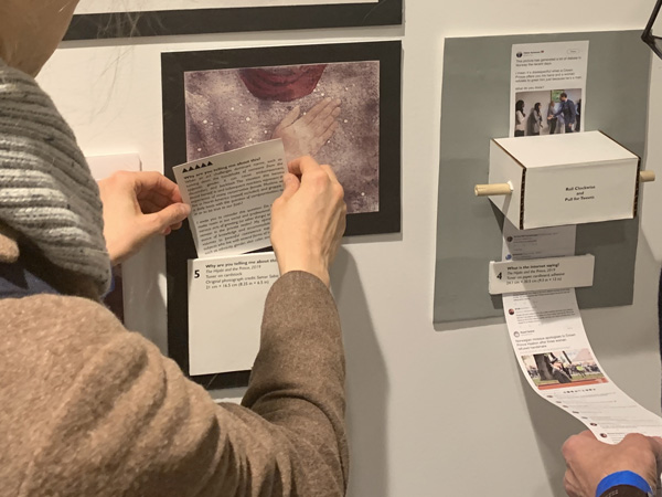 The second layer of information is communicated on secondary placards concealed behind the main placards. This concealment is intentional in order to: 1) make engagement with this topic and its ideological underpinnings optional, and 2) make an analogy to the way difference tends to be pushed to the private realm in our societies. Interested viewers would have to come closer and pull out the secondary placards – this renders the engagement both optional and intentional. The Twitter roll showcases the internet reactions so that the viewer has a more encompassing understanding of this controversial question: was the Muslim woman rude in staying true to her religions and turning down the prince’s handshake? The roll length indicates that the internet had a lot to say (and I did not include all the tweets).
