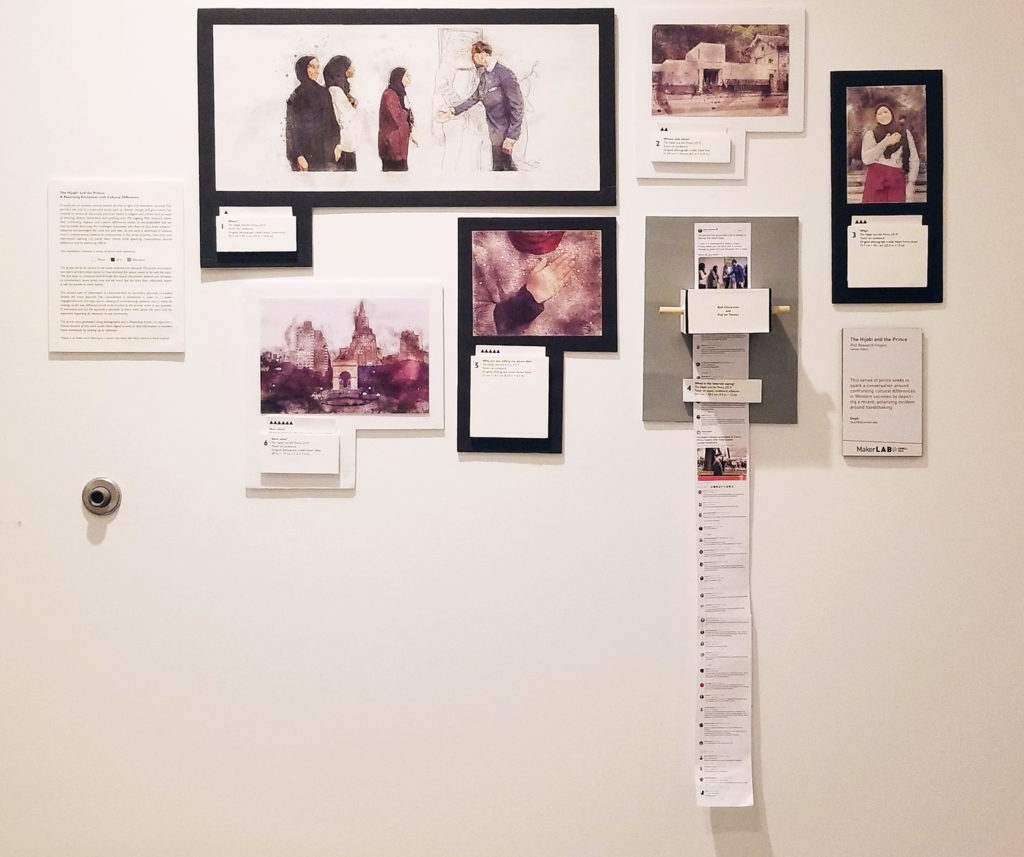 Partly an art installation, partly a lo-fi (low-fidelity) prototype, this project investigates how interactive objects can engage on behalf of their makers in the narration and indirection of difficult topics pertaining to hegemonic cultural norms. Like the Hijabi Mannequin, this project is a proxy object but it covers a different topic: handshaking cross genders in Islamic traditions. The series of Photoshop generated watercolor-like prints depict the true story of a Hijabi woman who turned down the handshake of the Norwegian prince when he visited her mosque. The prints go into the what, why, conflicting twitter reactions, and the implications of that story for Western contexts. The last print suggests that “next time you meet someone new, consider asking how they like to be greeted”.